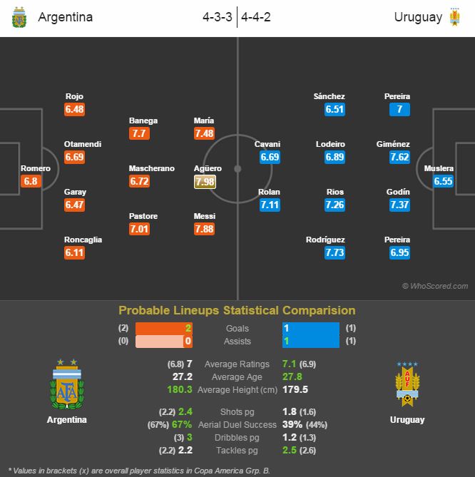아르헨티나는 첫 경기 파라과이전에서 비기면서 부담이 생겼다. 동시에 목적 의식도 강해질 것으로 보인다. 지난 월드컵 보다 전력이 좋아 보인다. FW 아게로(맨시티)가 절정의 컨디션이어서 FW 메시에 대한 의존도를 줄일 수 있다. 디 마리아(맨유) 실바(맨시티)까지 포함된 연계 플레이에서도 분명 강점을 지니고 있다. 우루과이는 자메이카를 1-0으로 꺾어 다소간 여유가 있다. 수아레즈의 빈 자리는 신예 FW 롤란(보르도)가 맡고 있으며 카바니(PSG)와 함께 투톱 전형으로 나선다. 정적인 카바니 보다 롤란의 ‘크리에이티브’ 한 움직임이 나와야 한다. 또한 DF 고딘(ATM)을 중심으로 수비 실책이 나와선 어렵다.