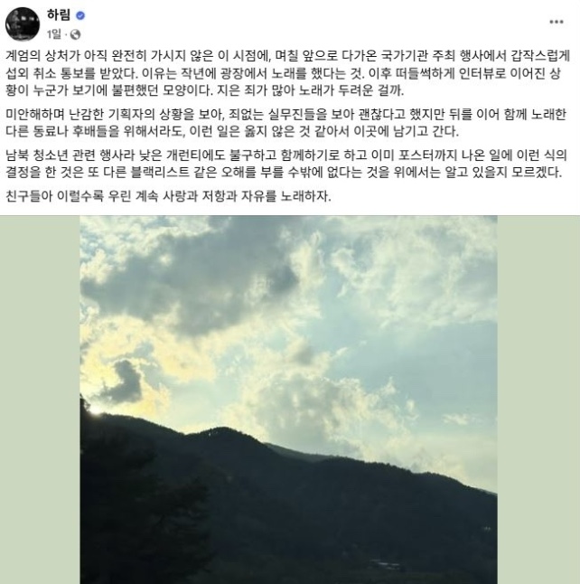 하림은 “남북 청소년 관련 행사에 섭외됐다가 갑작스럽게 취소 통보를 받았다. 이유는 작년 광장에서 노래를 했다는 것”이라고 적었다. 그는 “저는 낮은 개런티에도 불구하고 함께하기로 했고, 이미 포스터까지 나온 상황에서 갑작스러운 결정을 내린 것은 또 다른 블랙리스트를 부를 수 있다는 점을 잘 알고 있을지 모르겠다”고 우려했다.