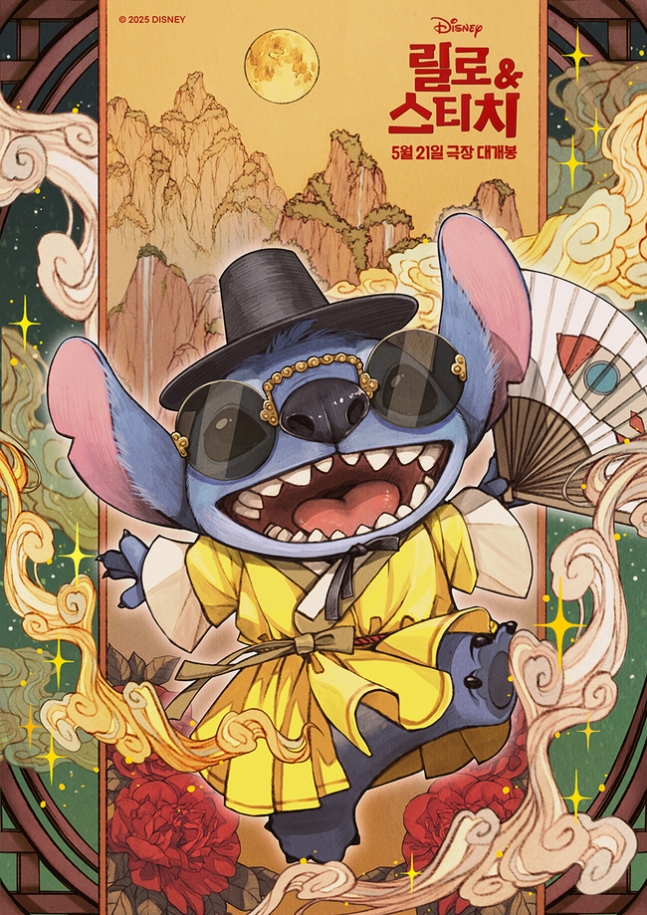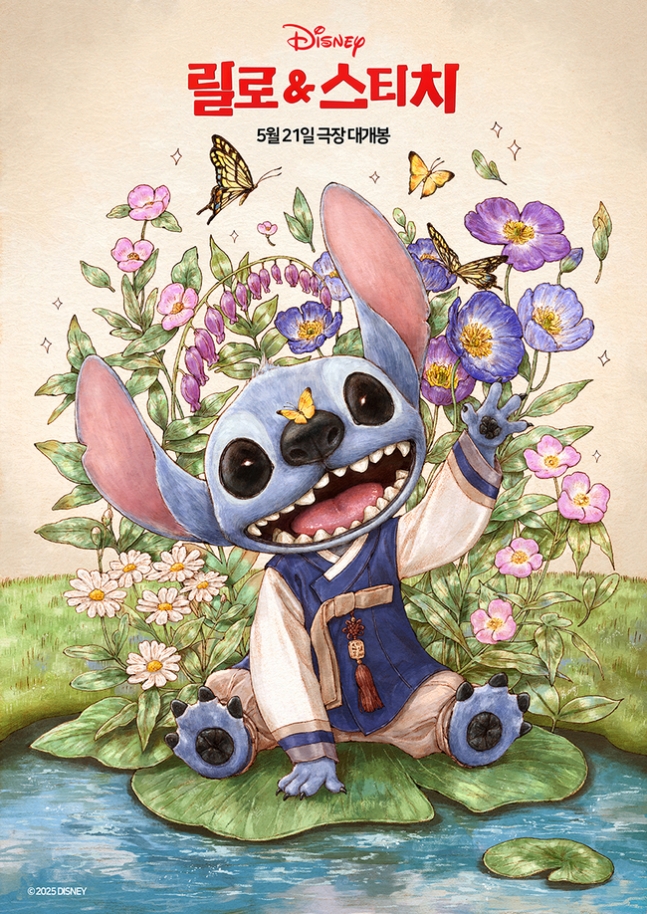 이번 한국화 포스터 작업에는 일러스트레이터 애뽈, 김스타, 혜강 작가가 참여해 한국적인 정서와 색채를 ‘스티치’ 캐릭터에 담아내 독특한 매력을 자아냈다. 공개된 포스터 속 스티치는 한복을 입고 꽃밭에서 나비와 어우러져 뛰노는 모습부터 노란 한복과 곤룡포를 소화하는 귀여운 장면까지 다채로운 한국식 표현으로 표현됐다.