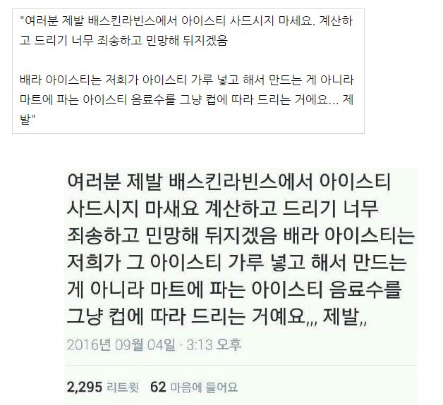 "여러분 제발 배스킨라빈스에서 아이스티 사드시지 마세요"