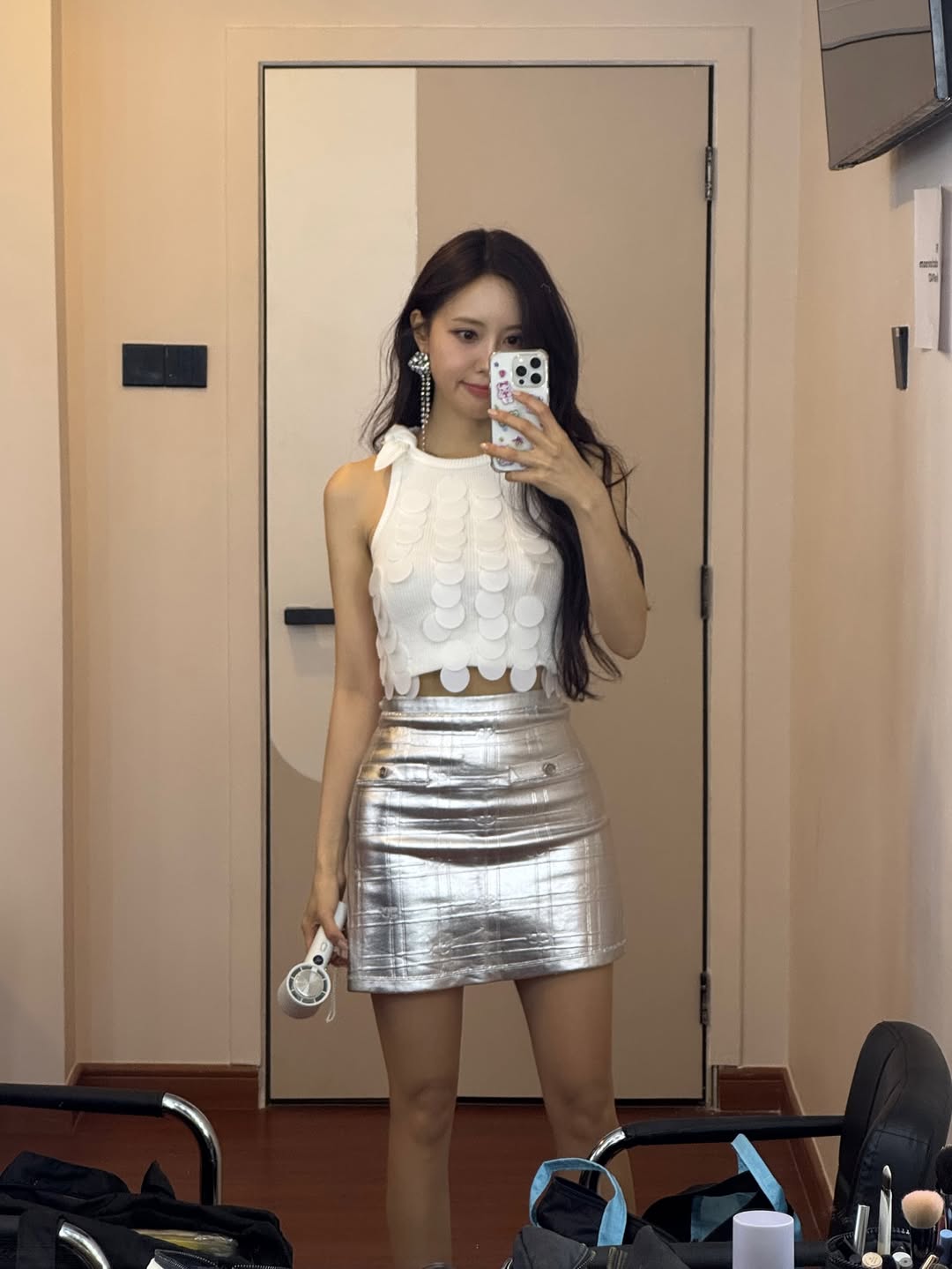 효민이 착용한 의상은 대형 스팽글을 연상케 하는 입체 패턴의 슬리브리스 크롭톱과 미니스커트로 구성된 화이트 투피스였다. 볼륨감 있는 상의와 다리 라인을 강조한 하의의 조합은 균형 잡힌 실루엣을 완성했으며, 여기에 화이트 스틸레토 힐을 매치해 전체 룩의 완성도를 높였다.