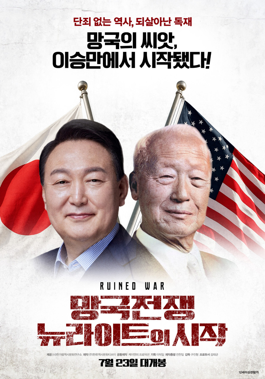 이번에 공개된 메인 포스터는 이승만 전 대통령과 윤석열 대통령의 얼굴을 나란히 배치하며 단순한 정치비판을 넘어선 역사적 계보를 시각적으로 압축해 보여준다. 일장기와 성조기가 배경으로 깔린 가운데, “이승만에서 윤석열까지, 친일·매국 뉴라이트는 치우자!”라는 강렬한 문구가 이 영화가 담고 있는 문제의식을 드러낸다.