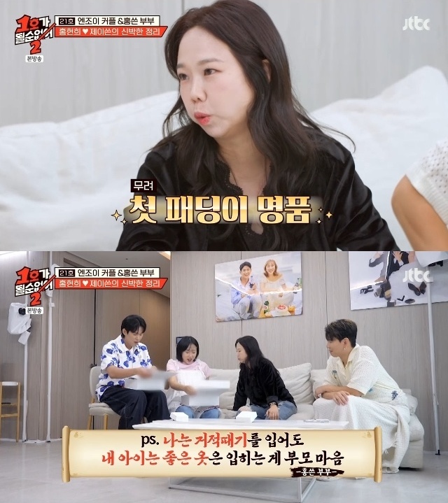하지만 진짜 플렉스는 그 다음이었다. 홍현희는 “라라가 나한테 특별한 후배고 고마운 친구라 준비했다”며 명품 브랜드 몽클레르 패딩 상자를 조심스럽게 내밀었다. 박스를 연 순간, 아기용 패딩 두 벌이 등장했고 손민수는 놀라움과 감동에 말을 잇지 못했다.
