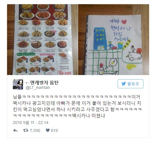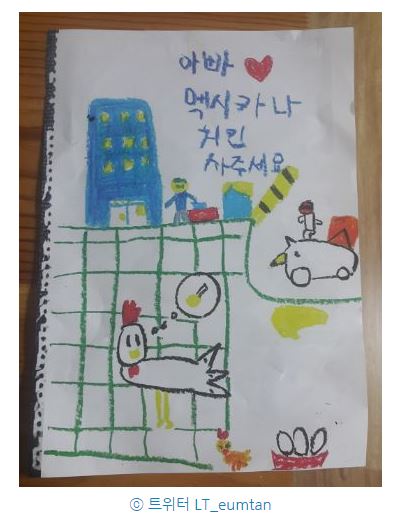 광고지에는 스케치북을 뜯어 크레파스로 그린 그림이 있고 그 위에 삐뚤빼뚤한 글씨가 "아빠♥ 멕시카나 치킨 사주세요"라고 쓰여있다.