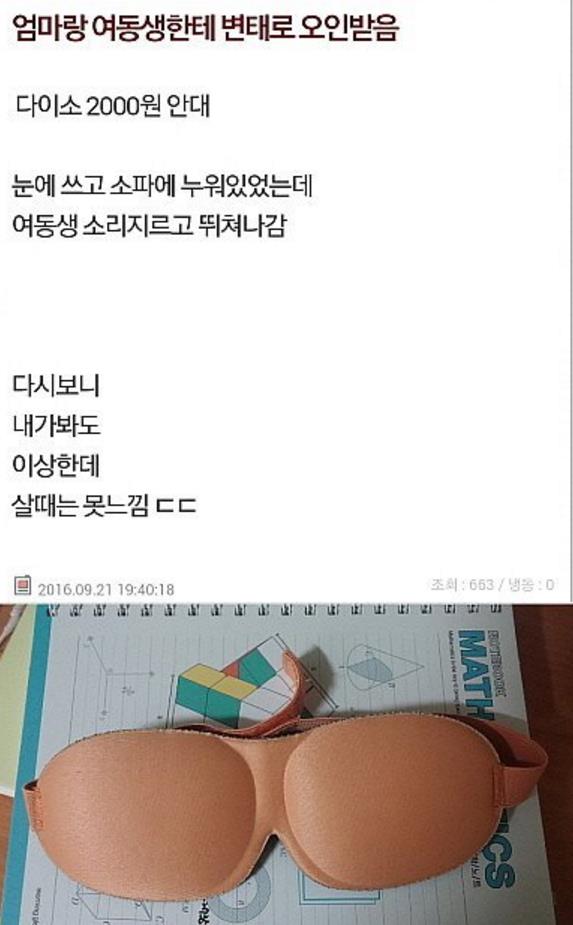 최근 한 대학교 온라인 커뮤니티에서는 한 누리꾼이 다이소에서 산 안대 때문에 엄마랑 여동생에게 변태로 오인을 받았다며 게시물을 작성했다. 누리꾼이 다이소에서 구매한 안대의 생김새는 다음과 같다.