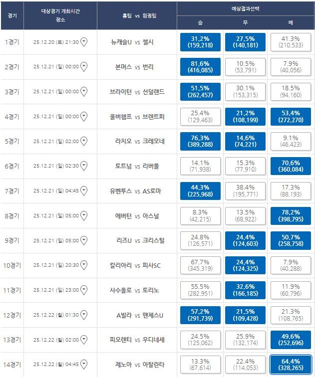 -> 해외 돈의 흐름은 첼시 쪽으로 몰리는 상황. 덕분에 정배를 받은 팀이 첼시로 바뀐 경기다. 뉴캐슬의 부상 변수가 여전히 많다는 점을 최우선으로 반영한 것일 수 있다. 하지만 뉴캐슬의 홈 강세 및 두 팀의 상대성을 고려했을 때 역배를 받은 뉴캐슬이 최소 패하지 않을 가능성을 보고 접근하는 것이 좋다. 복수 체크를 추천하는 이유.
