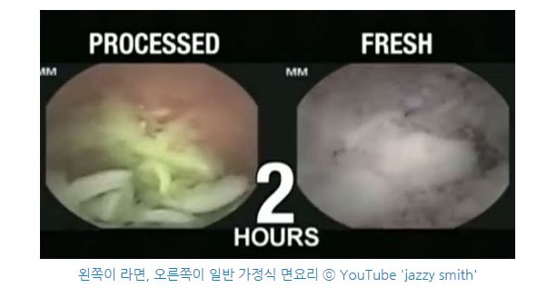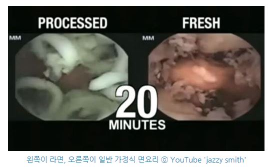 라면을 먹고 나면 속이 더부룩했던 이유를 알 수 있는 영상이다.