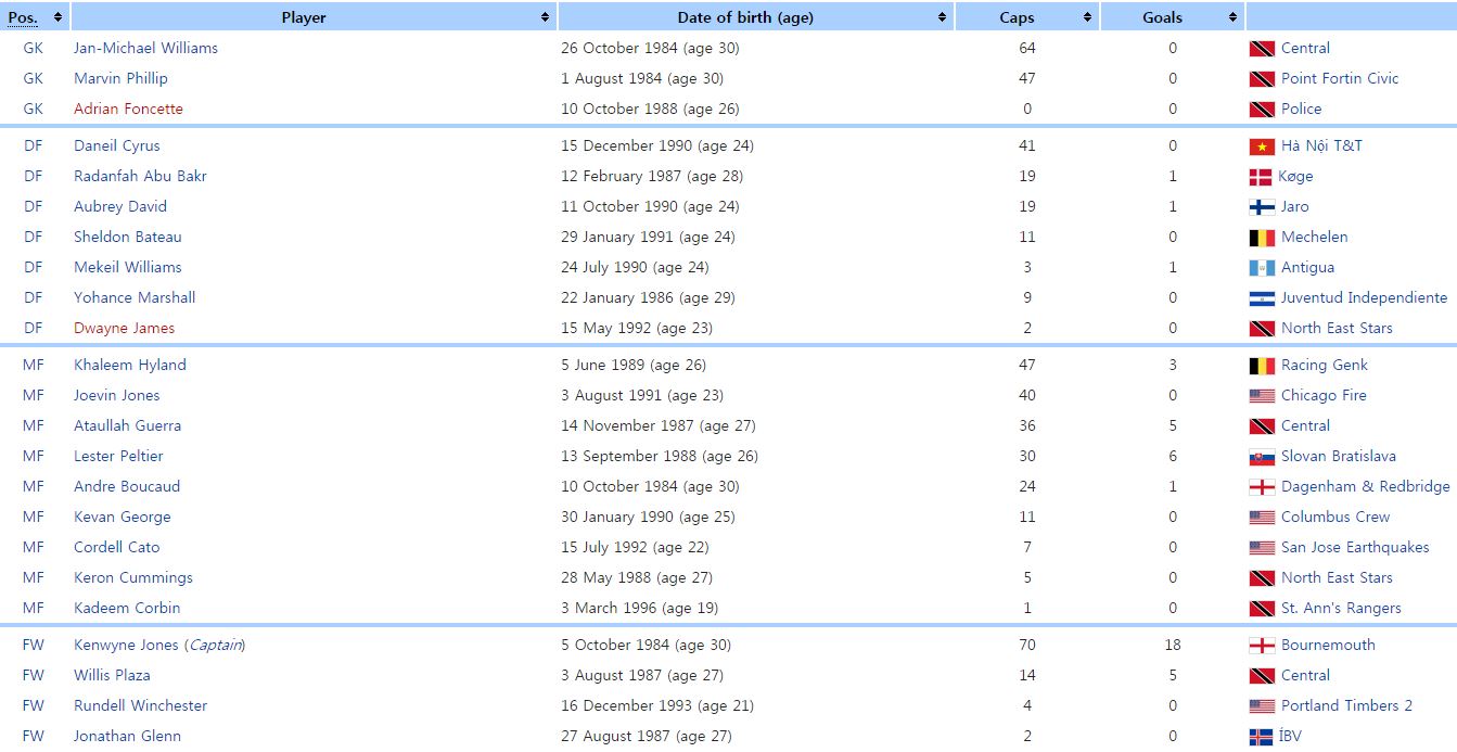 트리니다드 토바고는 EPL 경험이 많은 FW 켄윈 존스(본마우스)가 버티고 있다. A매치 70경기로 현 대표팀 중 가장 많은 경험, 또 A매치 18골로 가장 많은 골을 기록하고 있다. 상당 부분 그에게 의존하는 플레이가 많을 듯한데 상대의 집중 견제를 어떻게 뚫느냐가 관건. 존스를 제외하면 미국무대, 자국리그서 뛰는 선수가 많다. 골드컵을 앞두고 이렇다할 평가전을 치르지 못해 경기력을 얼마나 유지하고 있을지 의문이다.