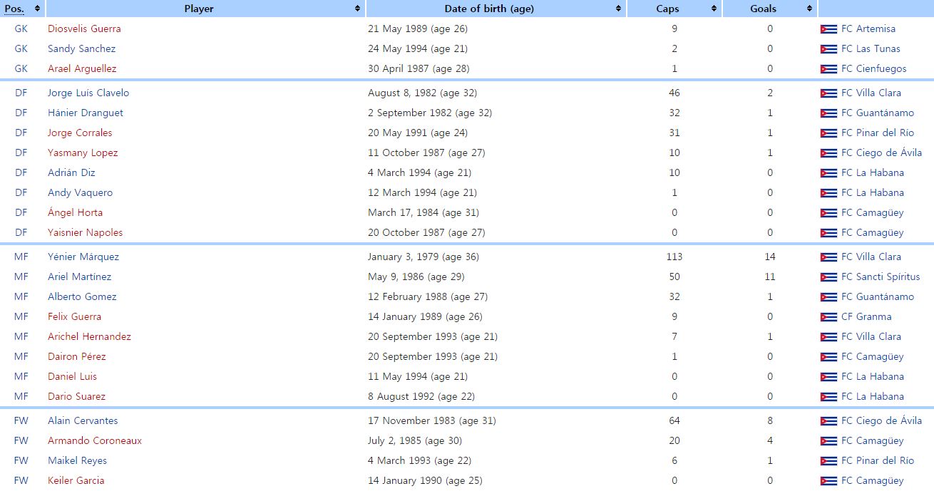 쿠바는 C조 최약체로 뽑힌다. 단 국가 제도적 특성상 전원이 자국리그 선수들로 채워져 조직력에 대한 기대가 크다. 최근 A매치 3경기서 2무 1패를 기록 중. 골드컵 예선서 2무를 기록했고 앞선 과테말라와 평가전서도 0-1로 패한 바 있다. MF 마르케즈(빌라클라라)가 A매치 113경기의 경험을 갖고 있다. 공격진에선 알랭 세르반테(데빌라)가 A매치 64경기 출장 경험을 지니고 있다.
