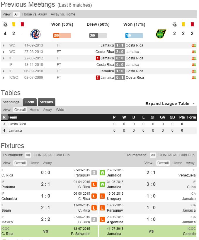 FIFA랭킹 65위인 자메이카는 코파 아메리카에도 도전장을 내밀었따. 그러나 우루과이, 파라과이, 아르헨티나에게 무득점 3연패를 당했다. 한가지 긍정적인 점은 남미 강호들을 상대로 단 3골 밖에 내주지 않았다는 것이다. 자메이카는 잉글랜드, 미국 리그에서 뚜는 선수들이 주축으로 이뤄져 있다. FW 매톡스(벤쿠버)가 자메이카의 핵심 공격수다. 자메이카의 과제는 빈공을 해소하는 것이다. 코스타리카와의 맞대결에서는 1승 3무 2패로 열세.