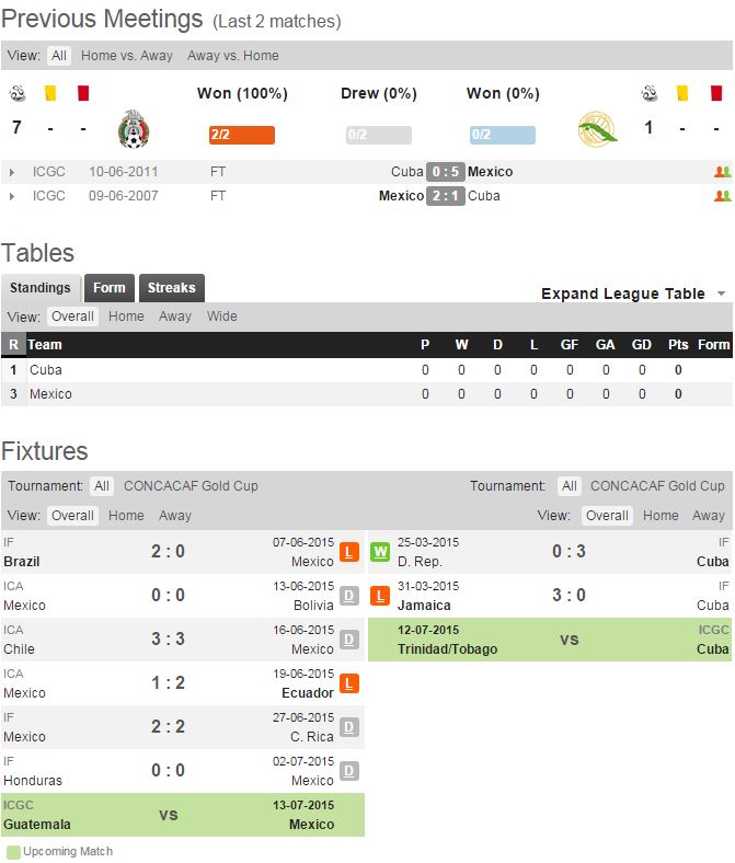 쿠바는 C조 최약체로 뽑힌다. 골드컵 4강 문턱도 단 한 번도 넘어서지 못했다. 그리고 23인 선수단 전원이 자국리그 선수들로 채워졌다. 선수 개개인 간의 조직력이 탄탄하다. 최근 A매치 3경기서 2무 1패를 기록 중. 골드컵 예선서 2무를 기록했고 앞선 과테말라와 평가전서도 0-1로 패한 바 있다. MF 마르케즈(빌라클라라)가 A매치 113경기의 경험을 갖고 있다. 공격진에선 알랭 세르반테(데빌라)가 A매치 64경기 출장 경험을 지니고 있다. 2000년대 이후 맞대결에서는 멕시코가 두 번 모두 승리(2-1, 5-0)했다.