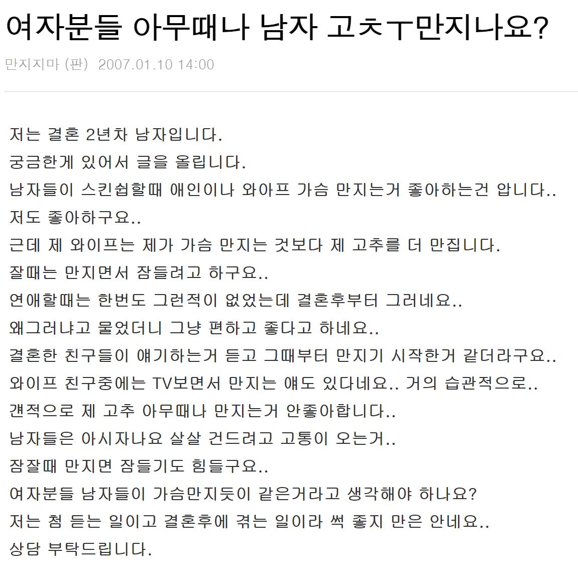 유부남의 고민은 와이프가 남편의 '성기'를 너무 많이 만진다는 것. 누리꾼의 글에 따르면 누리꾼의 와이프는 일상 생활을 하다가도 만지고, 잘 때도 만지면서 정말 시도때도 없이 남편의 성기를 만지는 것으로 전해진다.