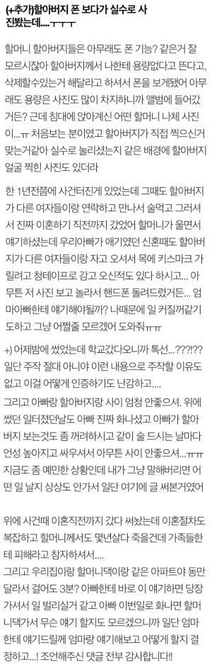 할아버지 휴대폰 속 사진첩을 봤다가 충격적인 사진을 봤다며 조언을 구하는 사연이 누리꾼들 사이에서 논란을 일으키고 있다.
