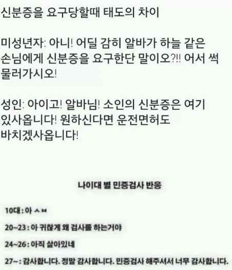이에 누리꾼들은 "정말 맞다", "난 가게 직원인데 손님이 성인인 것을 뻔히 알면서도 손님 입가에 미소가 번지는 게 너무 보여서 일부러 신분증 검사를 하고 있다"며 큰 공감을 드러내고 있다.