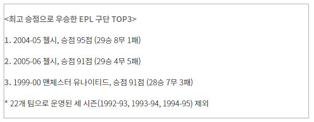 올시즌 프리미어리그 우승은 첼시가 유력하다. 현재 시즌 종료까지 3경기를 남긴 상황에서 2위 토트넘과 승점 차이가 7점이다. 다가오는 주말 브로미치 원정에서 승리하면 맨유와 격돌하는 토트넘 결과에 따라 자력 우승을 확정할 수 있다. 그렇다면 첼시는 과거의 첼시를 뛰어넘을 수 있을까. 역대 프리밍어리그 우승팀의 승점 TOP3는 아래와 같다.