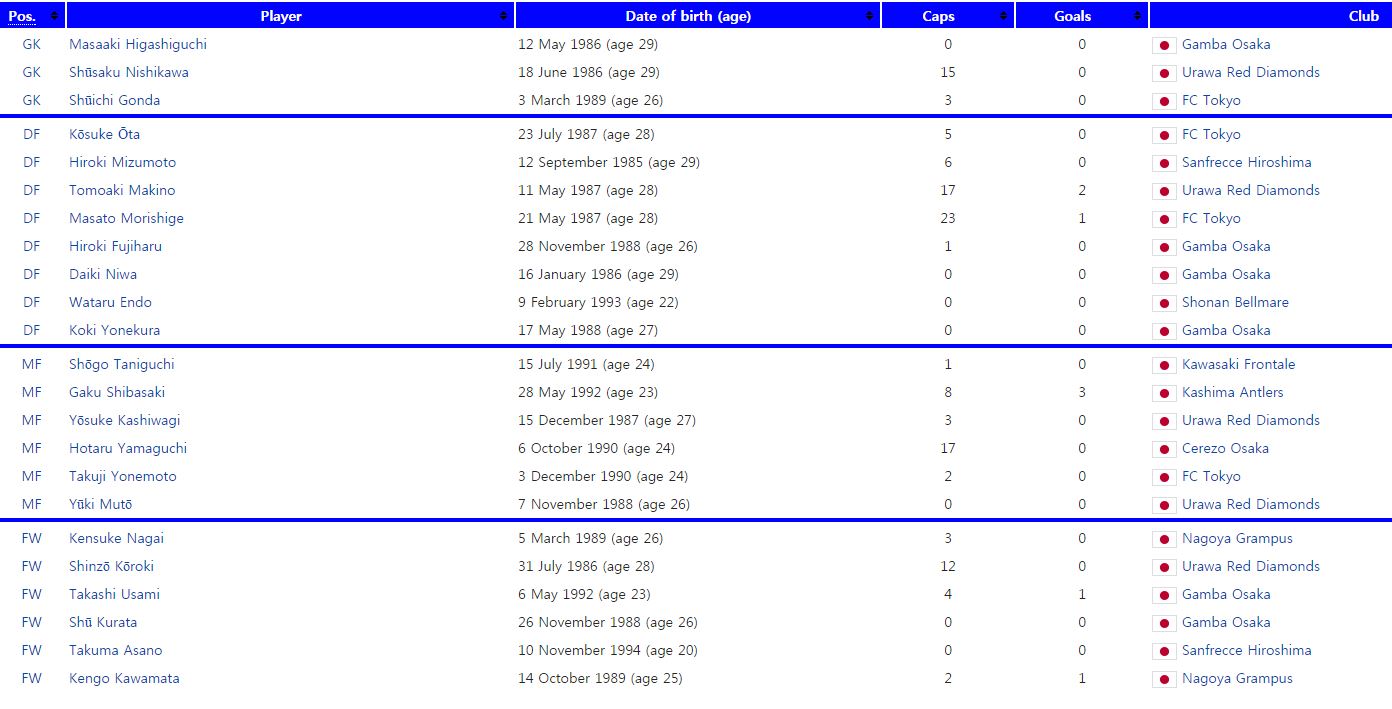 가가와 신지, 혼다 케이스케, 나가토모 유토와 같은 익숙한 해외파를 찾아볼 수 없다. 동아시안컵에 참가하는 일본축구대표팀은 전원이 J리거다. 지난 해 트레블을 차지한 감바오사카 소속 6명, 올시즌 전반기 무패행진을 달렸던 우라와레즈 소속 5명의 선수가 눈에 띈다. 최전방은 팀 공격의 핵 FW 고로키(우라와), 떠오르는 신예 우사미(감바)가 포진할 전망이다. 각각 A매치 12, 4경기 출전 경력이 있다.