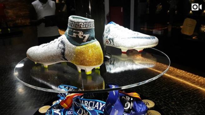 다이아몬드 패션 디자이너 토쿤보 다니엘은 최근 자신의 SNS를 통해 특별 제작한 호날두 축구화를 공개했다. 특히 함께 공개된 영상에는 호날두 개인 박물관 'Museu CR7'에 전시된 축구화가 공개됐는데 은빛, 금빛 다이아몬드가 장식된 축구화가 위엄을 드러내고 있다.
