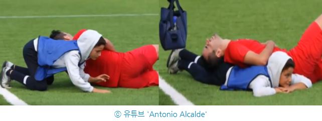 아길라르는 잔디 위에 엎드리더니 피네다 선수가 좀 더 숨을 편히 쉴 수 있도록 등받이가 돼줬다.