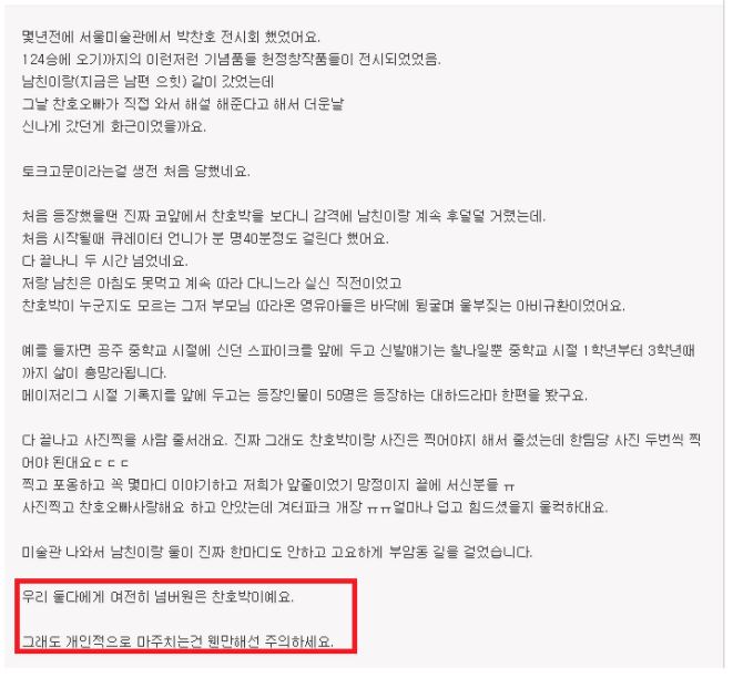 지난 2016년 한 누리꾼은 '토크고문'을 당했다며 "넘버원은 찬호박이다"면서도 "그래도 개인적으로 마주치는건 주의하시라"고 남겨 누리꾼들의 웃음을 자아냈다.
