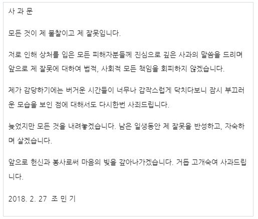 27일 조민기는 윌엔터테인먼트를 통해 "모든 것이 제 불찰이고 제 잘못입니다"라고 운을 떼며 "저로 인해 상처를 입은 모든 피해자분들께 진심으로 깊은 사과의 말씀을 드리며 앞으로 제 잘못에 대하여 법적, 사회적 모든 책임을 회피하지 않겠습니다"라고 사과했다.