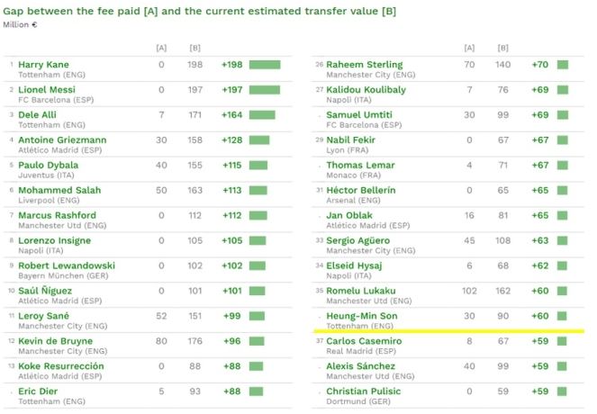 CIES는 19일(한국 시간) 유럽 5대 리그 선수의 이적료와 현재 가치 차이를 평가한 결과를 발표했다. 2015년 당시 토트넘은 손흥민 영입을 위해 바이에른 레버쿠젠에 3000만 유로(당시 408억 원)를 지불한 것으로 알려졌다. 3년여가 채 지나지 않은 현재 손흥민은 그 세배에 해당하는 9000만 유로(약 1185억) 가치를 인정받고 있다. 그 차이만 무려 6000만 유로(약 790억 원)에 해당한다.