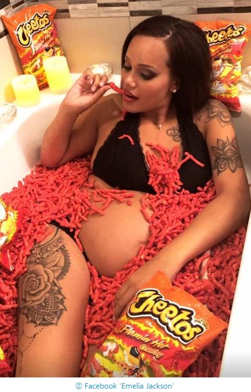 평소 에밀리아는 치토스를 너무 좋아해 만삭 기념 사진을 촬영할 때도 치토스와 함께 사진을 찍었을 정도였다.