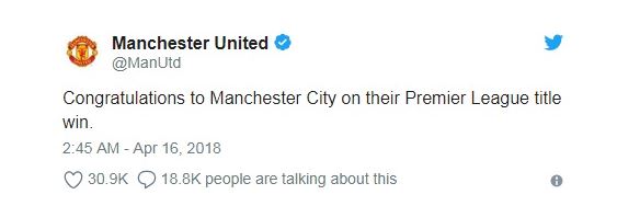 맨체스터 유나이티드는 공식 트위터에 맨시티 우승을 축하하는 짤막한 글을 올렸고, 팬들은 분노했다. 일부 팬들이 상대를 존중하는 태도에 박수를 보내기도 했으나 경기 직후인 터라 다수의 서포터들이 "삭제하라"는 반응을 보였다.