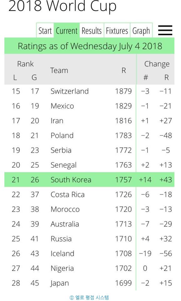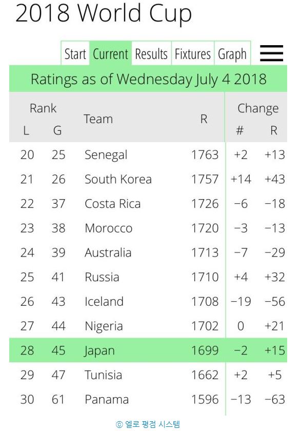 이게 어떻게 된 일일까. 비밀은 새 FIFA랭킹 시스템 '엘로 평점 시스템' 산정방식에 있다. (링크>>>https://www.eloratings.net/2018_World_Cup)