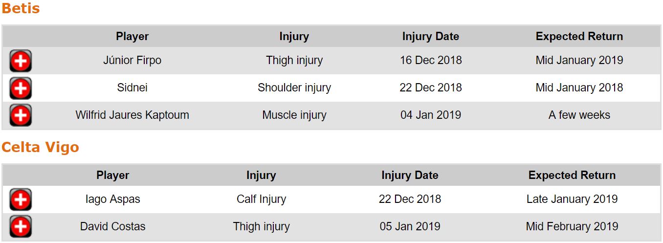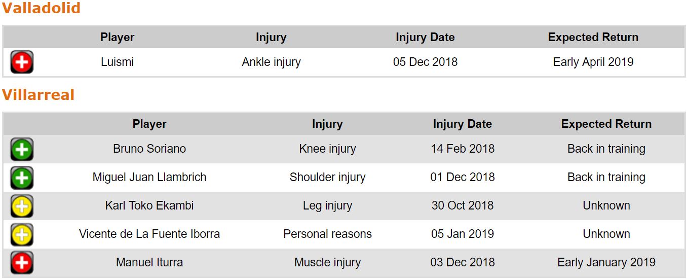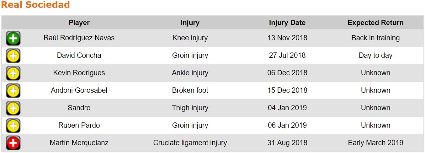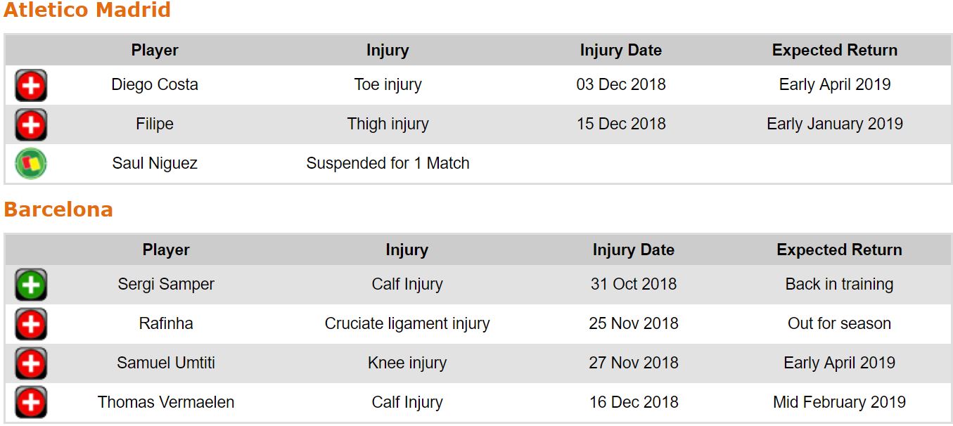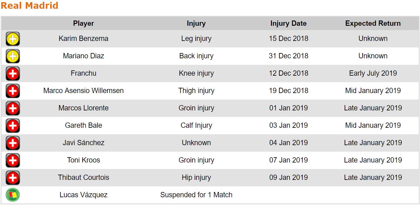 프리메라리가 19라운드 각 팀 부상자 및 결장 예정 선수