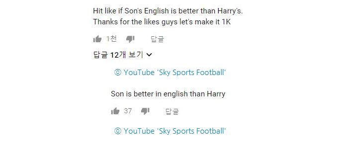 또 다른 유튜브 이용자가 남긴 "손흥민 영어가 해리 케인보다 낫다고 생각하면 '좋아요'를 누르세요"라는 댓글도 '좋아요'를 1천개 이상 받았다.