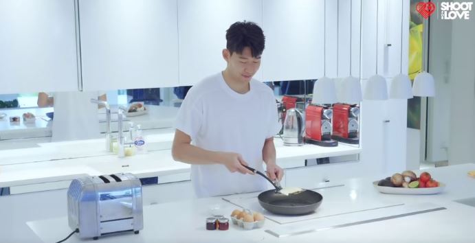 손흥민 선수는 아침에 일어나자마자 주방에서 토스트를 만들었다. 그는 빵과 달걀, 햄을 집어 던져 만든 토스트를 들고 가며 "역시 햄은 토튼햄(토트넘)이지!"라고 말했다.