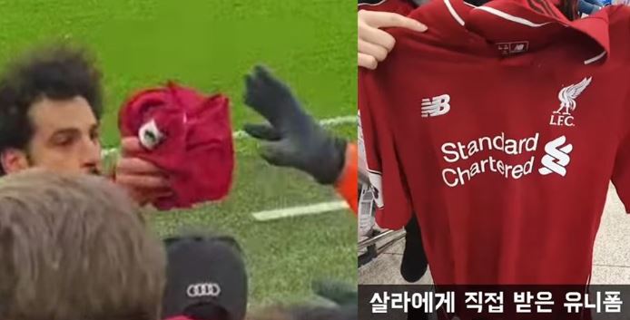 경기가 끝나고 리버풀을 응원하는 한 한국인 팬이 살라에게 유니폼을 받았다.