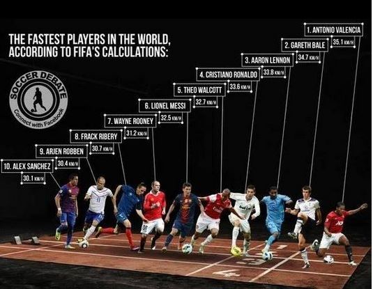 지난 2015년 기준입니다. 1위가 맨유 소속 발렌시아로 측정됐는데 35.1km/h를 찍었죠. 그 뒤를 베일, 레넌, 호날두와 같은 선수가 잇고 있네요