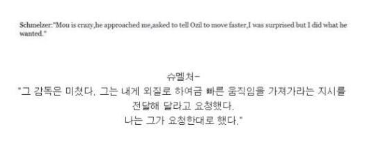그리고 슈멜처는 친절하게도 외질에게 무리뉴 감독 지시를 전달했다는군요 ㅋㅋㅋㅋㅋ