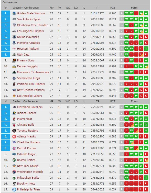 ◆NBA 21일 현재 순위 및 최근전적
