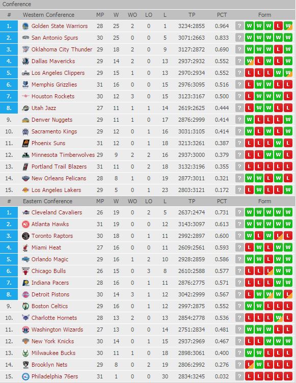 ◆NBA 25일 현재 순위 및 최근전적