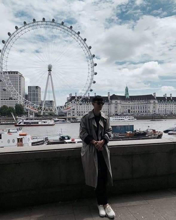 구름이 멋진 하늘 아래 템즈강과 런던 아이, 런던 시가지를 배경으로 두고 선글라스를 낀 손 선수는 트렌치코트를 입은 채 손을 모으고 자세를 취했다.