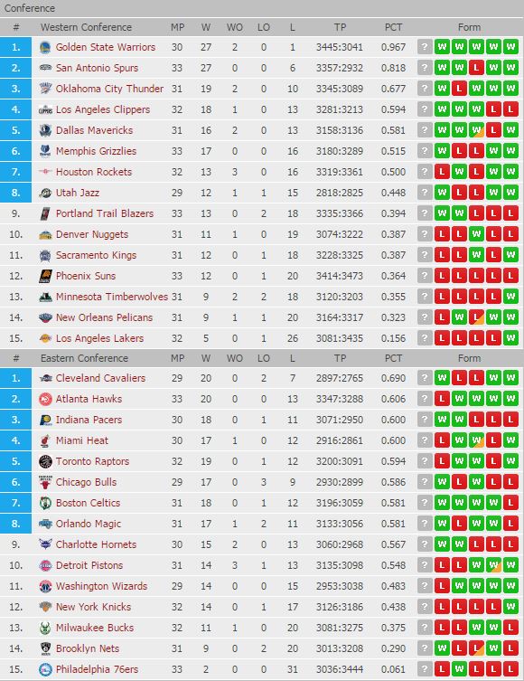 ◆NBA 29일 순위 및 전적