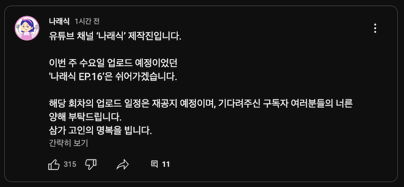 31일 박나래의 유튜브 채널 커뮤니티에는 “이번 주