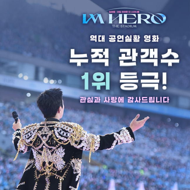임영웅의 스타디움 입성기를 담은 영화 '임영웅│아임 히어로 더 스타디움'이 역대 공연 실황 영화의 누적 관객수 1위를 기록하며 35만 돌파를 눈앞에 두고 있다.
